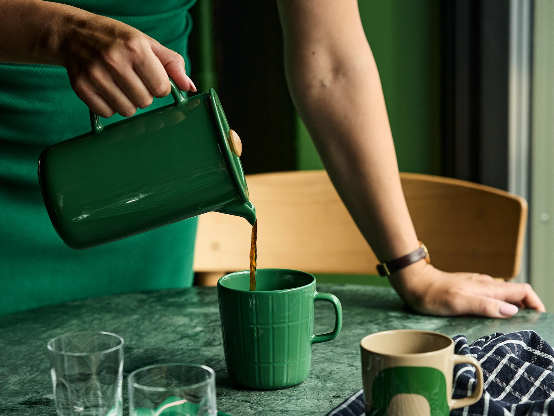Deconstruction では懐かしさが重要なポイントなので、クラシックなデザイン、レトロな形や色、そしてリサイクル素材が合います。美しい陶磁器、チェッカー柄のラグやテキスタイル、温もりのあるウールのアームチェアなどを取り入れましょう。